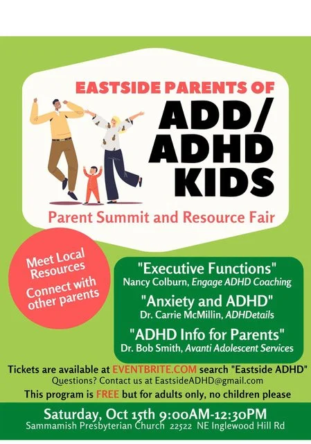 The Eastside Parents of ADD/ADHD Kids group is excited to announce that we will be hosting our fourth community resource fair and summit on October 15th, 2022 in Sammamish. Similar to past formats, this event will feature speakers who are professionals in the field of ADHD, space for a resource fair, and an opportunity for parents to meet. We are proud to continue to offer this as a free event for parents and caregivers of kids/teens/young adults with ADD/ADHD-- a huge feat made possible by volunteers and amazing vendors like you!