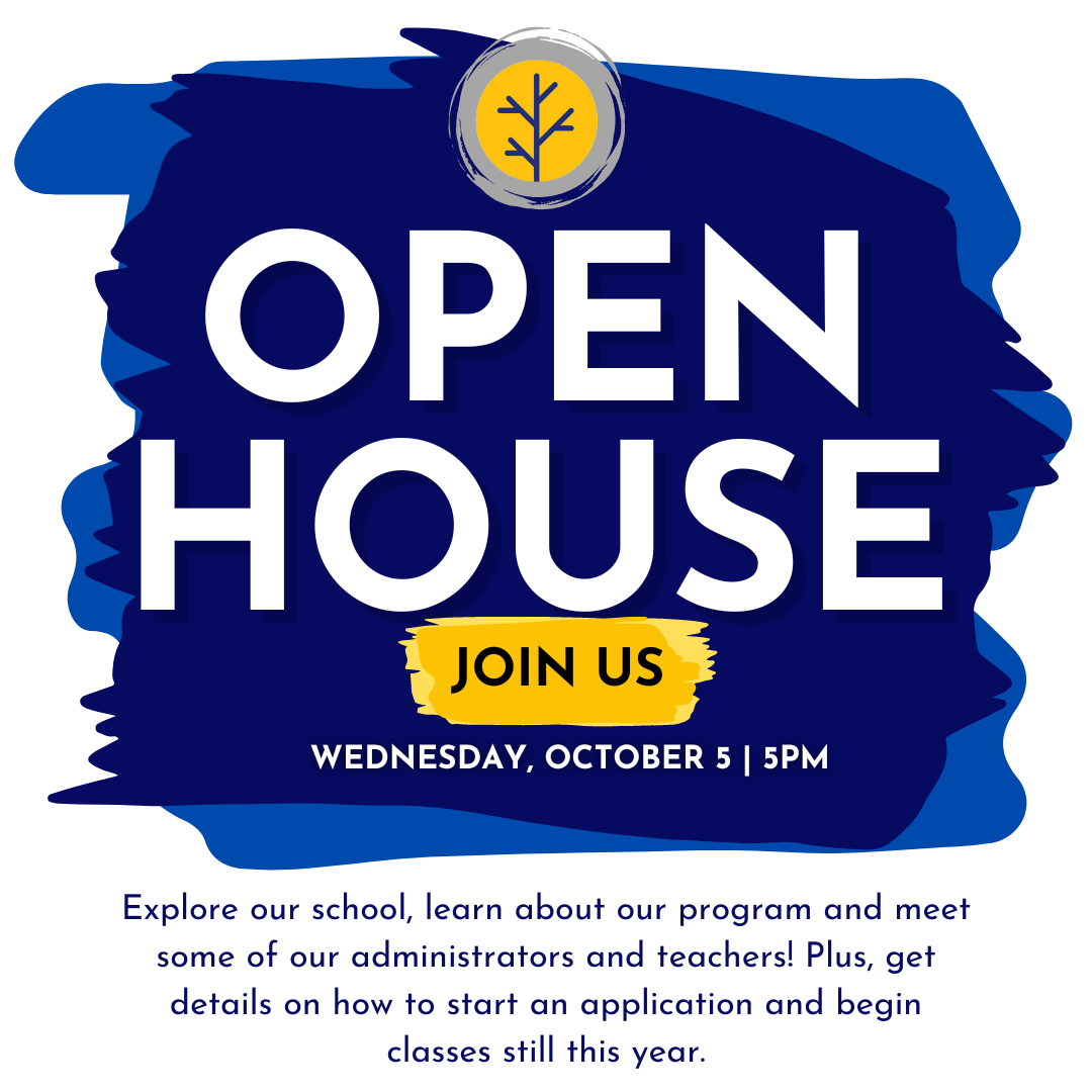 Join us on Wednesday, October 5 at 5pm for an on campus open house! Explore our school, learn about our program and meet some of our administrators and teachers! Plus, get details on how to start an application and begin classes still this year.